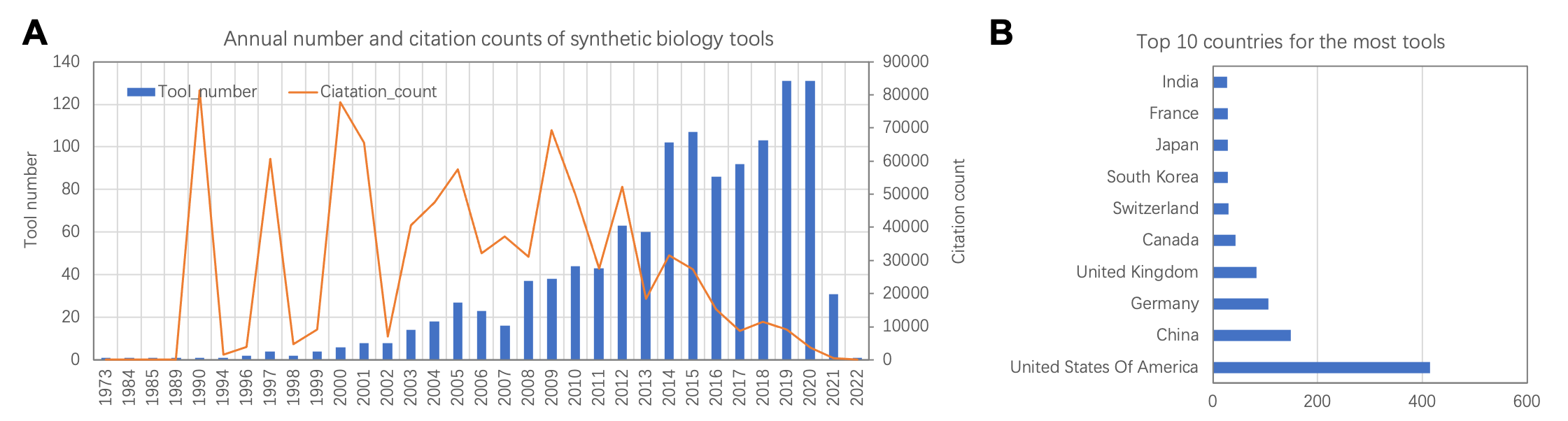 1. Annual number and citation counts of synthetic biology tools (A) and Top 10 countries contributing the most tools in SynBioTools.
