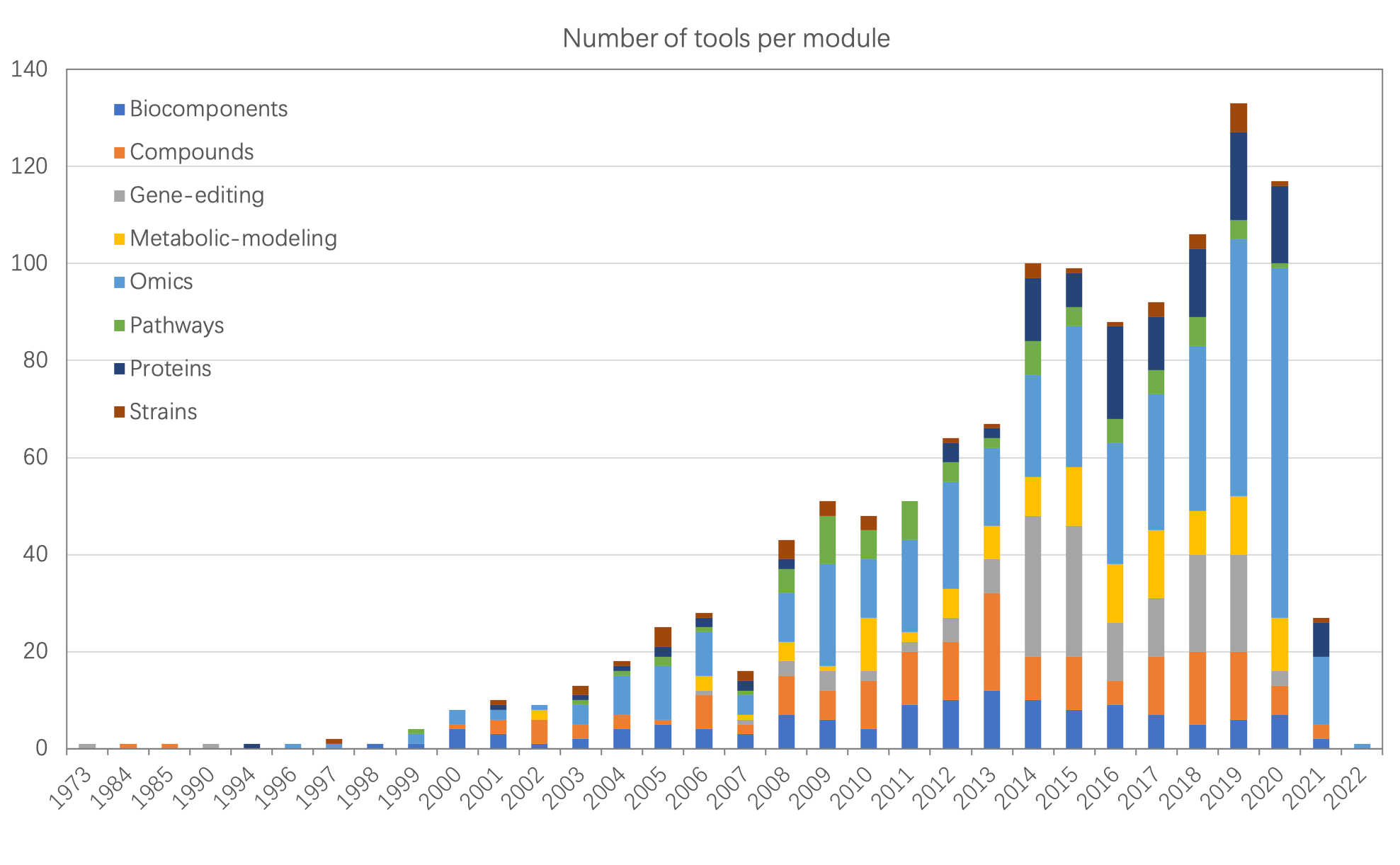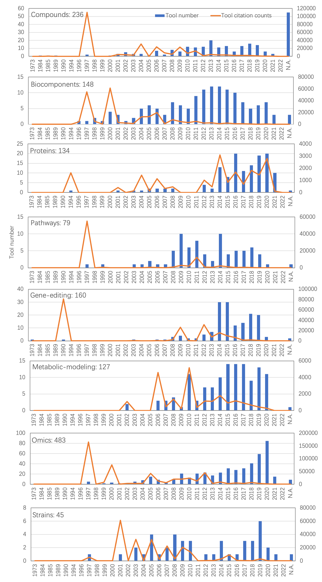 3. Tools and citations for each module. Annual tool number and tool citation count for 8 modules in SynBioTools.